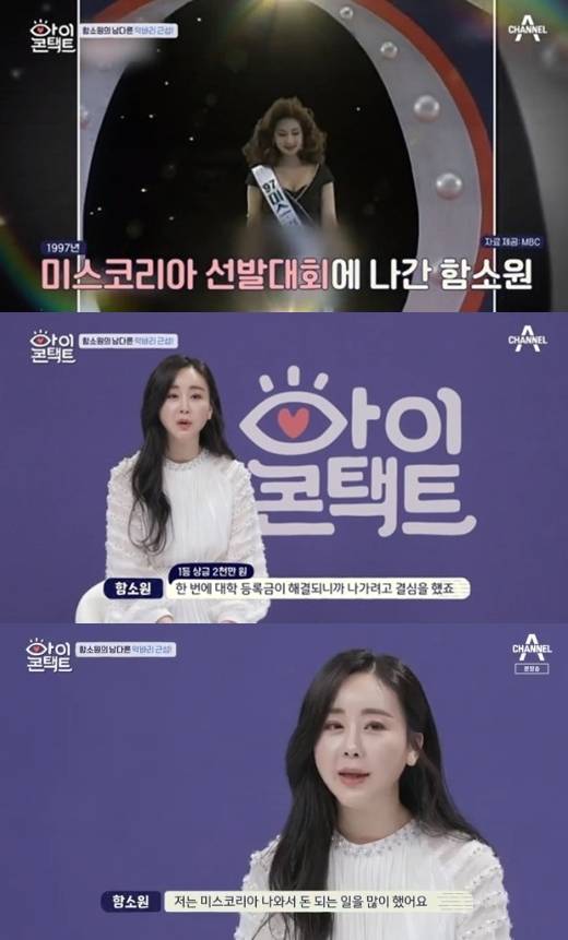 1997년 미스코리아 선발대회 미스 태평양 출신인 함소원은 “대학교 등록금이 없었다. 미스코리아 1등 상금이 2천만 원이라는 전단지를 봤는데, 한 방에 등록금이 해결되는 상황이라 나가기로 결심했다”고 밝혔다.