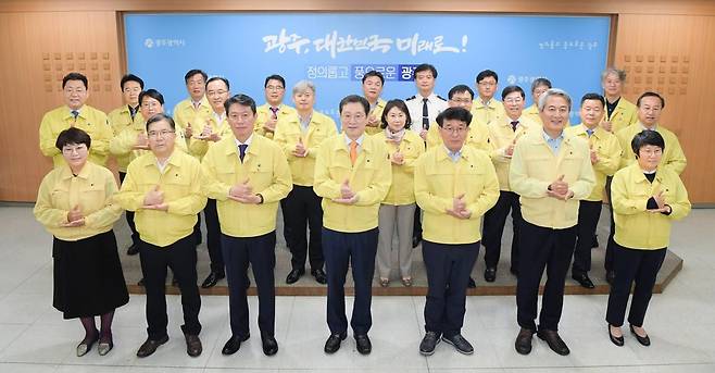 (서울=연합뉴스) 광주시 간부 공무원들이 28일 오전 시청 브리핑룸에서 의료인에게 고마움을 전하는 '덕분에 챌린지'에 참여하고 있다. [광주시 제공. 재판매 및 DB 금지]