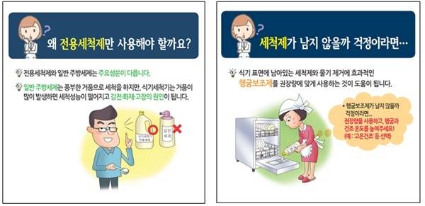 식약처는 “반드시 식기세척기 종류별 제품 사용법을 따르고 세척제‧헹굼보조제는 권장량만 사용할 것을 당부한다”면서 “앞으로도 일상생활에 안심을 더할 수 있도록 생활안전 정보를 지속적으로 발굴하여 제공할 계획이다”라고 전했다.