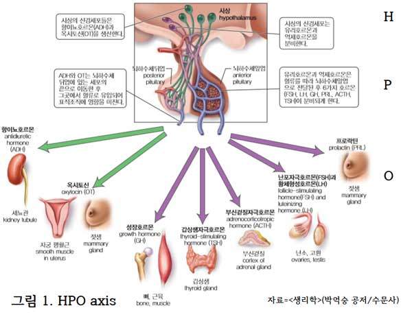 만약 시장에서 스포츠카를 사려는 사람이 많아지면, 사장(hypothalamus)은 스포츠카를 더 만들라고 본사에 ‘지시(releasing hormone)’를 내리게 되고, 본사(pituitary gland)는 스포츠카를 몇 대 만들지 고민한 뒤, 지역에 있는 스포츠카 생산 공장에 구체적인 ‘주문서(tropic [stimulating] hormone)’를 보낸다. 공장(target organ)에서는 필요한 대수의 스포츠카를 생산하여 납품한다. ‘사장-본사-공장(hypothalamus-pituitary-organ)’의 개념으로 이해하면 되는 것이다. 우리 몸에는 호르몬과 관련된 다양한 축(HPO axis)들이 존재한다. 만약 여러분이 HPO axis를 잘 알고 있다면, 내분비 질환이 생겼을 때 어디에 어떤 문제가 생겼는지 쉽게 이해할 수 있다.