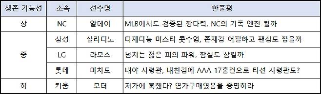 * 새 외국인 타자 5인, 생존 가능성 및 한줄평