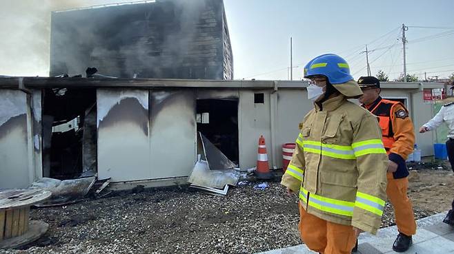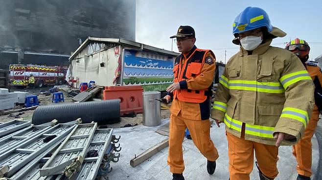 이천시 공사장 화재현장 살펴보는 정문호 소방청장