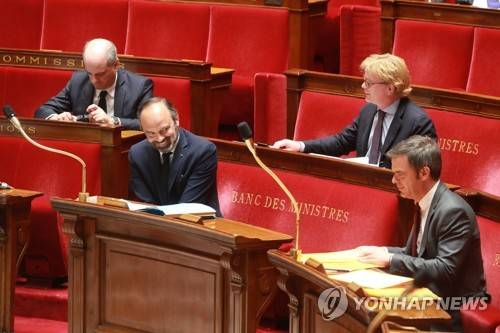 epa08391137 French French Prime Minister Edouard Philippe (2-L) smiles during a session of questions to the government at the National Assembly, one day after the plan to exit from the lockdown situation has been voted in Paris, France, 29 April 2020, on the 44th day of a lockdown aimed at curbing the spread of the COVID-19 pandemic, caused by the SARS-CoV-2 coronavirus. EPA/LUDOVIC MARIN / POOL MAXPPP OUT