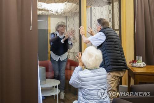 A daughter sits in the visitor's box and speaks with her parents, who are in the retirement home Burgerheim Thun, on Wednesday, 29 April 2020 in Steffisburg, Switzerland. Countries around the world are taking measures to stem the spread of coronavirus. (Peter Klaunzer/Keystone via AP)
