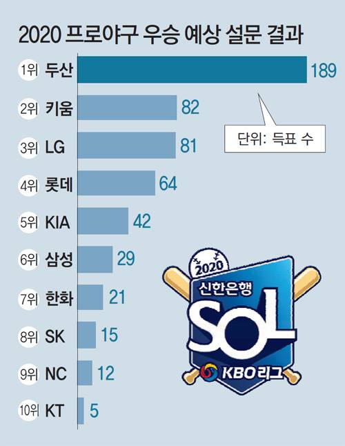 동아일보는 국내 최대 야구 팬 커뮤니티 ‘엠엘비파크’ 등을 통해 4월 28일부터 사흘간 올해 예상 우승 팀을 설문 조사했다. 전체 참가자 540명 가운데 3분의 1이 넘는 35%(189명)가 두산을 꼽았다. 두산은 최근 5년 연속 한국시리즈에 진출해 그중 세 차례(2015, 2016, 2019년) 정상을 차지하면서 2010년대 최강팀으로 평가받고 있다.
