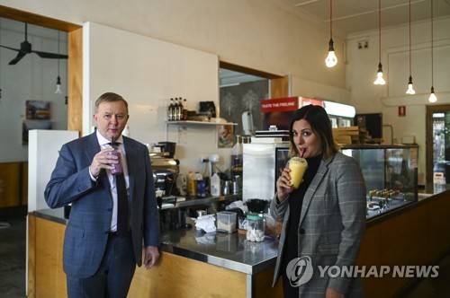 epa08394746 Australian Opposition Leader Anthony Albanese (L) and Labor candidate for preselection for the seat of Eden-Monaro Kristy McBain (R) drink a smoothy drink at a cafe in Queanbeyan, Australia, 01 May 2020. Albanese is endorcing McBain in the upcoming Eden-Monaro by-election. EPA/LUKAS COCH AUSTRALIA AND NEW ZEALAND OUT
