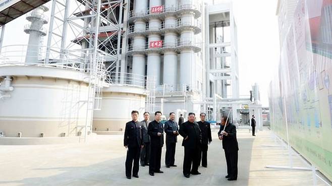 순천인비료공장 준공식에서 마스크를 쓴 참석자들이 김정은 국무위원장 쪽으로 박수를 보내고 있다.