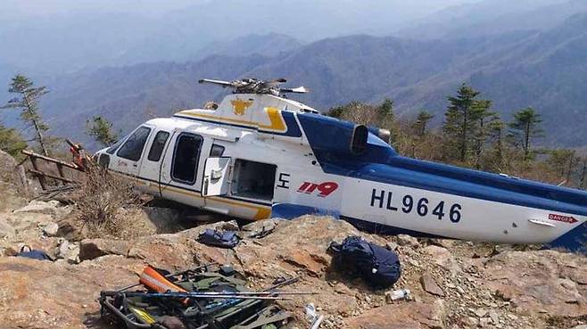 어제 낮 12시 6분쯤 경남 산청군 지리산 천왕봉에서 구조작업을 위해 15m가량 떠서 제자리 비행을 하던 소방헬기가 환자를 호이스트로 올리던 중 균형을 잃으면서 불시착했습니다.
