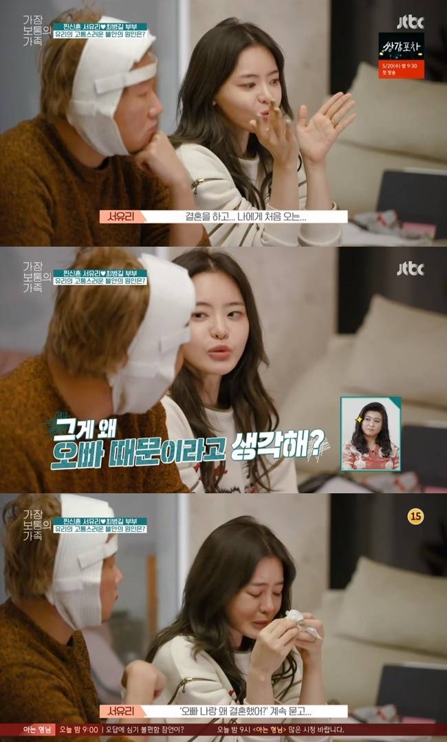 서유리는 최병길과의 대화 중 “결혼을 하고 처음 온전한 안정감을 느꼈다. 갑자기 안정감이 들어오니까 적응이 안 되더라. ‘내가 이렇게 행복해도 되는가?’라는 생각을 하게 됐다”고 울며 털어놨다. 서유리는 울다가 공황발작 증세를 보이며 쓰러졌다. 서유리는 과거 일찍 돌아가신 아버지를 위해 가장의 역할을 계속 해왔다. 최병길은 그런 서유리를 다독였다. (사진=JTBC ‘가장 보통의 가족’ 캡처)