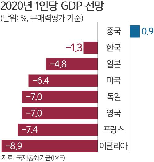 이런 전망이 나온 것은 코로나19 팬데믹(세계적 대유행)에 따른 글로벌 경기 침체 때문이다. IMF에 따르면 한국을 비롯한 세계 대부분 국가에서 올해 PPP 기준 1인당 실질 GDP가 준다.