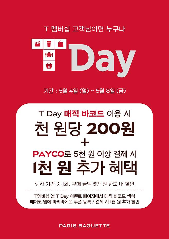 파리바게뜨가 가정의 달을 맞아 SK텔레콤 T멤버십 가입자를 대상으로 'T-데이 프로모션'을 진행한다.