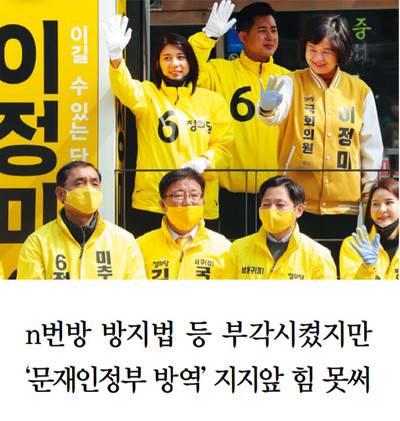 4월2일 시작된 선거운동 국면에서 정의당은 ‘준연동형 비례대표제를 도입한 선거제도 개혁의 원칙을 유일하게 지키는 정당’이라는 점을 부각하는 전략을 썼다. 선거기간에 ‘텔레그램 엔(n)번방’ 사건이 불거지자 총선 이후 ‘엔번방 방지법’을 통과시키겠다고 밝힌 민주당과는 달리 원포인트 국회를 열어 즉시 법안을 처리해야 한다고 맞섰다. 그러나 코로나19 방역 성공으로 지지율 고공 행진을 하고 있던 문재인 정부에 대해서는 명확하게 선을 긋기보다 “문재인 정부의 개혁 완수를 돕겠다. 촛불정부의 소임을 소홀히 하지 않도록 만들겠다”는 수위로 타협했다. 이런 선거 전략은 결과로 평가받았다. 정의당은 지역구에서 심상정(고양갑), 여영국(창원성산), 이정미(인천연수을) 등 세명을 당선 가능권으로 봤지만 지역구 생환자는 심 대표 하나였다. 정당투표에서도 비례대표 5석을 확보하는 데 그쳤다.