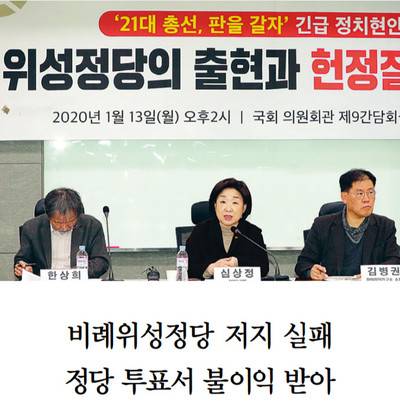 2월 초 미래통합당이 비례위성정당인 미래한국당을 창당하면서 ‘반미래통합당’ 진영에서도 위성정당 불가피론이 고개를 들었다. 2월 말 친민주당계 시민단체가 주축이 된 정치개혁연합이 “비례의석 싹쓸이를 통한 미래통합당의 과반 의석 확보를 저지해야 한다”는 논리로 민주당·정의당·녹색당 등이 참여하는 비례연합정당 창당을 제안했다. 하지만 정의당 전국위원회는 연합정당 참여를 만장일치로 거부했다. 이후 민주당은 정치개혁연합이 아닌 플랫폼 정당 ‘시민을 위하여’와 함께 위성정당인 더불어시민당을 창당했다. 위성정당은 정의당이 감당할 수 없는 악재로 작용했다. 역대 총선에서 지역구 투표는 민주당에, 정당투표는 진보정당에 해온 전략적 교차투표층이 정당투표에서 대거 민주당계 위성정당으로 기운 것이다. 정의당은 끝내 10%의 벽을 넘지 못했다.