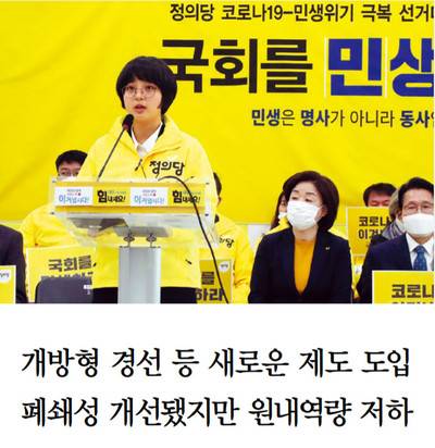 총선을 앞두고 정의당은 당원투표 70%와 시민투표 30%를 반영해 비례대표 후보를 선출하는 개방형 경선제와, 비례대표 후보의 정책역량을 평가하는 ‘무지개 배심원단’ 제도를 도입했다. 그러나 3월 초 치러진 비례대표 경선은 정책 실무역량이 검증된 당내 인사들이 후순위로 밀리는 결과를 낳았다. 정의당이 당의 외연을 확장하기 위해 도입한 새 경선제도에 대해서는 평가가 엇갈린다. 고질적 정파구도와 폐쇄적 조직문화를 극복하기 위해 불가피한 선택이었다는 진단도 있다. 하지만 인지도와 조직투표에 의해 순번 결정이 좌우되면서 원내 역량의 전반적 저하를 자초했다는 비판도 만만찮다. 경선이 끝난 뒤 불거진 비례대표 1번 류호정 후보의 ‘대리게임’ 논란과 6번 신장식 후보의 무면허 음주운전 등의 논란도 선거기간 당의 지지율을 끌어올리는 데 악재로 작용했다.