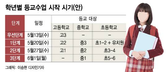 교육부에 따르면 고2·중3·초1~2학년과 유치원생은 20일, 고1·중2·초 3~4학년은 27일, 중학교 1학년과 초 5~6학년은 6월 1일 등교 개학한다.