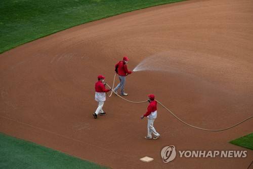epa08401816 Staff prepare the baseball field prior to the KBO (Korea Baseball Organization) regular season match between SK Wyverns and Hanwha Eagles at the SK Wyverns Baseball Park in Incheon, South Korea, 05 May 2020. The 2020 regular season began behind closed doors and was postponed from its original 28 March start date due to the coronavirus outbreak. EPA/JEON HEON-KYUN
