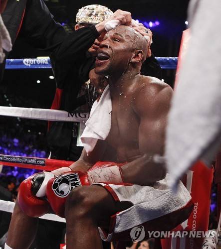 FILE - In this Saturday, May 5, 2012 file photo, Floyd Mayweather Jr. is doused with water in his corner between rounds during a WBA super welterweight title fight against Miguel Cotto, in Las Vegas. The head of the British Boxing Board of Control said Wednesday May 6, 2020, the body was working on an "apparatus” that would allow fighters to safely spit out water as they catch their breath between rounds. It's among dozens of protective measures under discussion under a plan to protect fighters from the coronavirus when boxing resumes in Britain, possibly in July. (AP Photo/Eric Jamison, File)