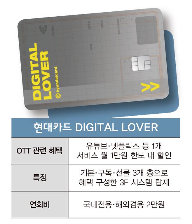 ‘현대카드 디지털 러버’(DIGITAL LOVER)는 온라인 쇼핑을 즐기고 트렌디한 문화생활을 영위하는 소비자에게 적합하다. 현대카드 디지털 러버에는 다른 성격의 혜택을 ▲기본 ▲구독 ▲선물이란 3개 층으로 구성한 ‘3F 시스템’이 탑재됐다. 1F는 상품의 기본 혜택 층으로 디지털 서비스 혜택을 제공한다. 유튜브 프리미엄·넷플릭스·멜론·지니 중 선택한 1개 서비스 이용요금을 매월 최고 1만원까지 할인해준다.