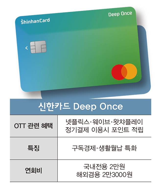 신한카드와 현대카드는 구독경제와 디지털을 정면 겨냥했다. 신한카드의 ‘신한카드 Deep Once’(이하 딥원스 카드)와 ‘신한카드 Deep Once Plus’(이하 딥원스 플러스 카드)는 자동납부 만능 카드다. 이 상품은 ▲디지털 구독 ▲렌탈 ▲생활 월납 3가지 영역에서 혜택을 준다.