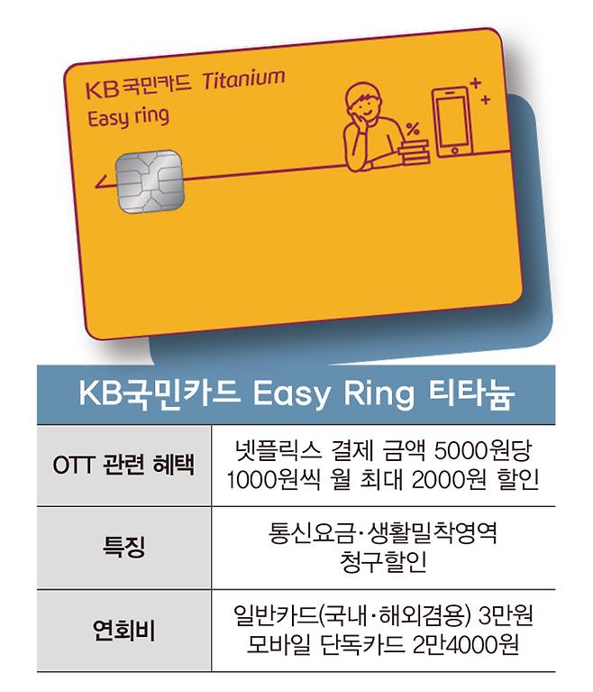 보다 넓은 범위에서 혜택을 누리고 싶다면 ‘생활밀착형’ 카드를 눈여겨보자. KB국민카드의 ‘KB국민 이지링(Easy Ring) 티타늄 카드’는 소비자 선호도가 높은 ▲이동통신 ▲온라인쇼핑 ▲음원·영상 서비스 ▲배달앱 ▲주유소 ▲대형마트 등 생활밀착 업종에서 할인 혜택을 제공한다.