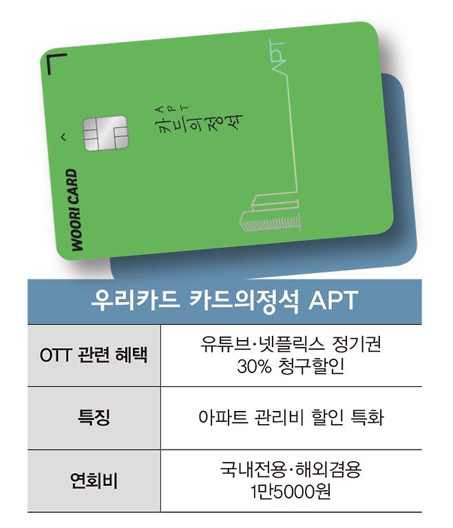 우리카드의 ‘카드의정석 APT’는 아파트 관리비 할인에 특화됐지만 OTT 서비스 관련 혜택도 탑재됐다. 이 상품은 카드의정석 APT 플래티넘, 카드의정석 APT, 카드의정석 APT 체크 등 신용카드 2종과 체크카드 1종으로 구성됐다. 신용카드로 아파트 관리비를 자동납부하면 전월 실적에 따라 월 최대 1만5000원까지 할인받을 수 있다. 체크카드는 월 최대 1만원을 할인해준다.
