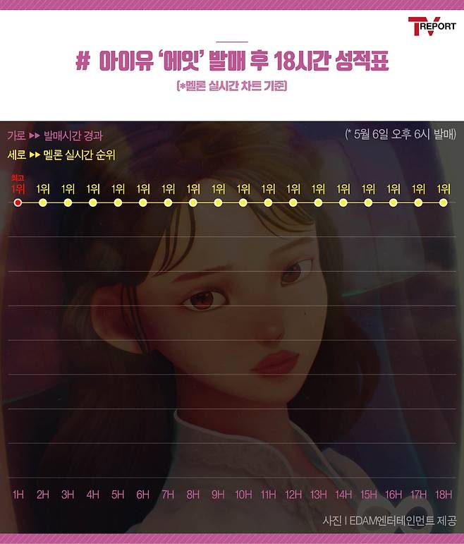 진입부터 음원 발표 후 18시간까지 쭉 1위를 기록한 건 아이유가 유일하다.