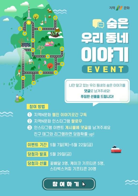 한국문화원연합회는 이번 인스타그램 공식 채널 개설을 기념해 오는 22일까지 웹진 '이곳' 구독 이벤트로 '숨은 우리지역 이야기'를 진행한다. 참여 방법은 '지역N문화' 공식 인스타그램 채널을 팔로우하고 월간 웹진 '이곳'을 구독한 뒤 인스타그램 게시물에 우리 지역에 대한 이야기를 댓글로 남기면 된다.