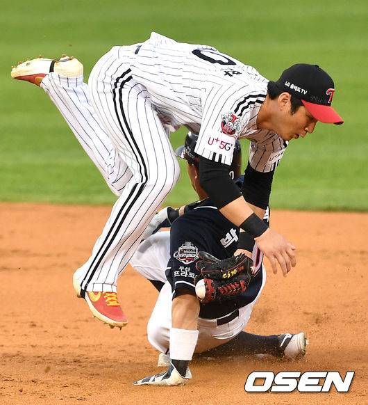 2회초 1사 1루 상황 두산 허경민 타석 때 주자 박세혁이 2루 도루를 시도했지만 LG 유격수 오지환의 태그에 걸려 아웃되고 있다. / dreamer@osen.co.kr