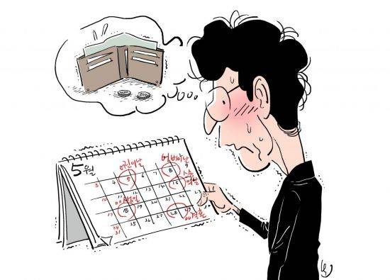 코로나19 여파는 2020년 '가정의 달'마저 무색하게 만들고 있다. 가족 간 만남을 자제하는 상황에 더해 경제적 부담도 평소보다 크게 다가오고 있어서다. 직장인 고모(36)씨도 매년 돌아오는 5월이 부담스럽다. 각종 기념일이 5월에 몰린 탓에 평소보다 비용 지출이 크게 늘기 때문이다. 그는 부모님 두 분의 선물을 챙겨드리고 외식하는 비용으로만 60만원을 예상하고 있다. 직장 동료나 지인들의 경조사도 주로 이달에 몰린 탓에 비상금까지 털어야 할 지경이라 한숨이 절로 나온다.