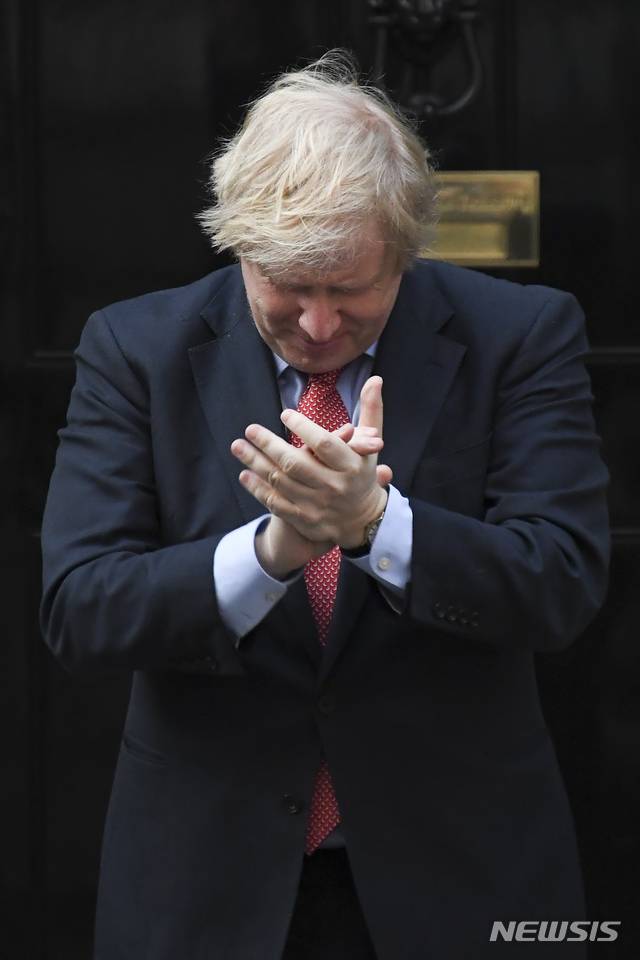 [런던=AP/뉴시스]보리스 존슨 영국 총리가 7일(현지시간) 런던 다우닝 10번가 계단에서 신종 코로나바이러스 감염증(코로나19)과 싸우는 이들을 위한 주례 '보살피는 이들을 위한 박수'(Clap for Carers) 캠페인에 동참해 박수하고 있다. 영국의 코로나19 누적 확진자 수는 20만6715명, 사망자는 3만615명으로 유럽 최다를 기록하고 있음에도 존슨 총리는 오는 10일 코로나19 봉쇄 조치 단계적 해제 계획을 발표한다. 2020.05.08.