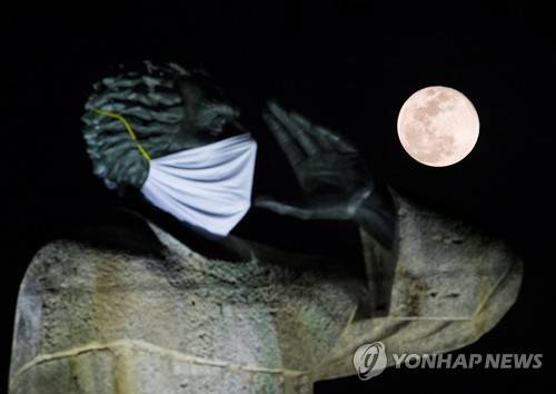 epaselect epa08408920 A full moon rises behind the statue of priest Antonio Montesino wearing a face mask in Santo Domingo, Dominican Republic, 07 May 2020. The full Moon of May, also known as Flower Moon, is the last of a series of four supermoons in 2020. EPA/ORLANDO BARRIA