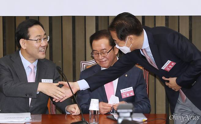 | ▲ 미래통합당 차기 원내대표에 출마한 주호영 후보와 권영세 후보가 8일 오전 서울 여의도 국회에서 열린 2020년 원내대표 및 정책위의장 선출을 위한 합동토론회에서 인사하고 있다. |