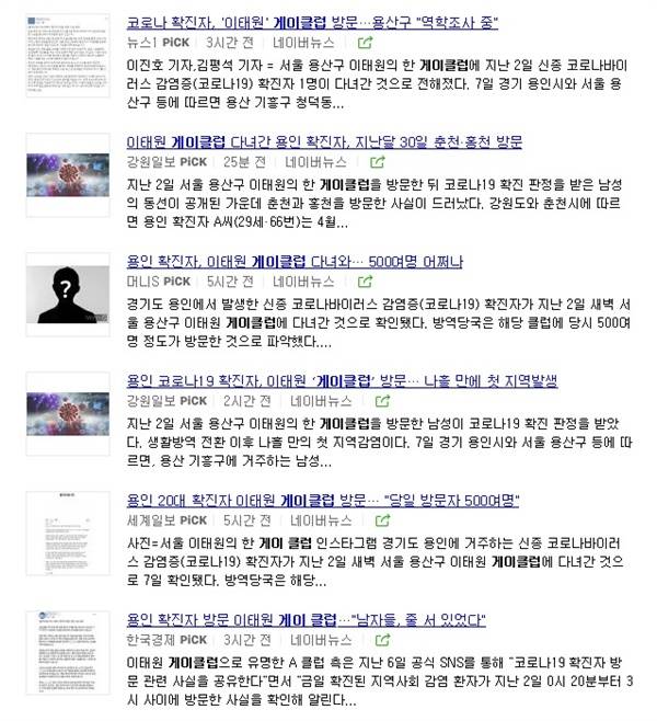 | ▲ 용인 66번 확진자 동선 관련 보도시 '게이클럽'을 사용한 모습들. 포털사이트 네이버 캡쳐. |