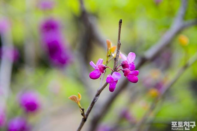 꽃 모양이 밥알과 비슷하다고 밥풀때기 나무라고 불렀던 꽃분홍색 박태기나무 꽃입니다.