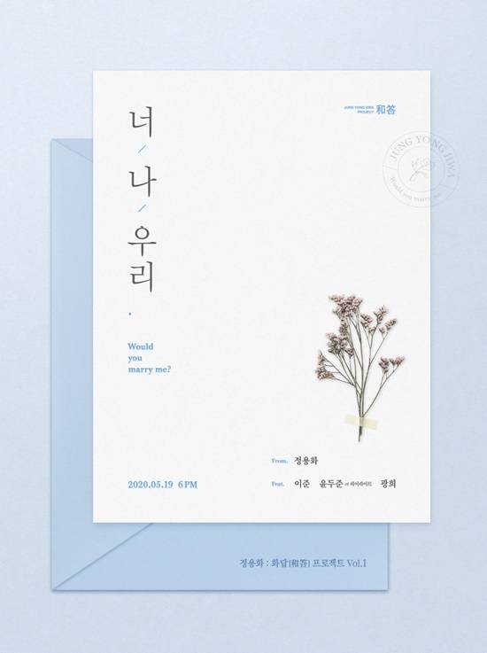정용화의 소속사 FNC엔터테인먼트는 11일 공식 SNS를 통해 정용화의 신곡 타이틀 포스터를 공개했다. 봄날의 청첩장을 떠오르게 하는 포스터에는 곡명 ‘너, 나, 우리 (Would you marry me?)’와 함께 정용화, 이준, 윤두준, 광희의 이름이 새겨져 있어 반가움과 기대감을 고조시킨다.