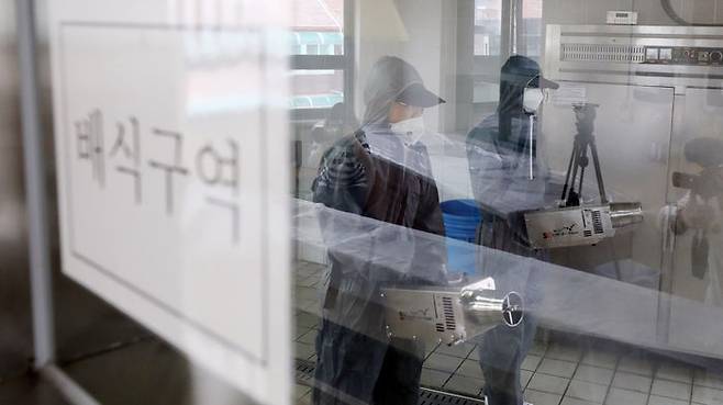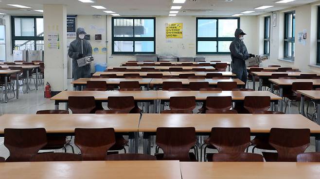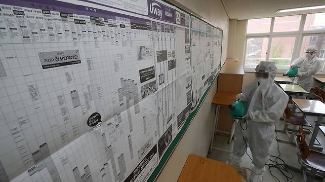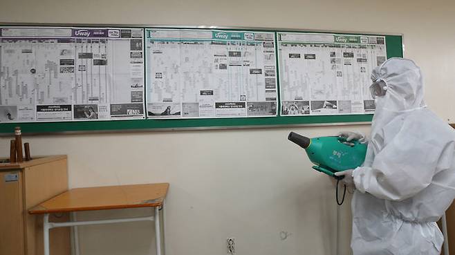 11일 오전 서울 송파구 영동일고등학교에서 송파구청 직원들이 개학을 앞둔 고3 교실 방역 소독을 하고 있다.