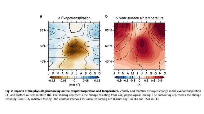 문제는 요즘처럼 높아진 이산화탄소의 농도에선 식물에서 나오는 수증기의 양이 줄어든다는데 있다. 대기 중 이산화탄소 농도가 높으면 식물은 기공을 조금만 열어도 광합성에 충분한 이산화탄소를 흡수할 수 있다. 식물이 기공을 조금만 열었기 때문에 식물체 내에서 밖으로 빠져나갈 수 있는 수증기의 양도 줄어든다. 기화되는 수증기의 양이 줄면서 주변 대기의 기온 상승을 억제할 요인도 같이 줄고, 그 지역의 온도가 상승하는 것이다. (아래 그림 참조, a의 노란색 부분이 증산작용 감소로 인한 증발 감소 l b의 빨간색 부분은 온도 상승)