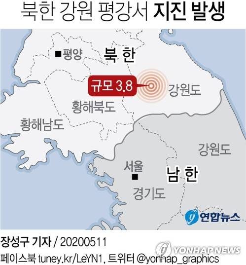 (서울=연합뉴스) 장성구 기자 = 11일 오후 7시 45분 6초 북한 강원 평강 북북서쪽 32km 지역에서 규모 3.8의 지진이 발생했다고 기상청이 밝혔다.