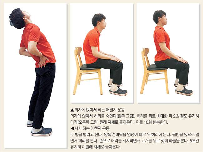 <정형외과 운동법>앉거나 서서 허리 '쭉' 펴주는 매켄지 운동.. 앞쪽 압력 줄이고 뒤쪽 섬유륜 아물게 해줘