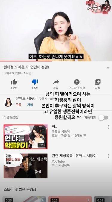 예은은 12일 SNS에 유튜버 시둥이(본명 송시인·23)의 영상을 캡처한 사진을 올리며 "남의 피를 빨아먹으며 사는 기생충의 삶이 본인이 추구하는 삶의 방식이고 유일한 생존전략이라면 응원하겠다"라는 글을 남겼다.