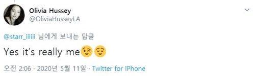 지난 9일 올리비아 핫세는 자신을 닮았다는 말에 기뻐하는 오마이걸 지호의 영상에 하트와 기쁨의 이모티콘 댓글을 달았습니다.