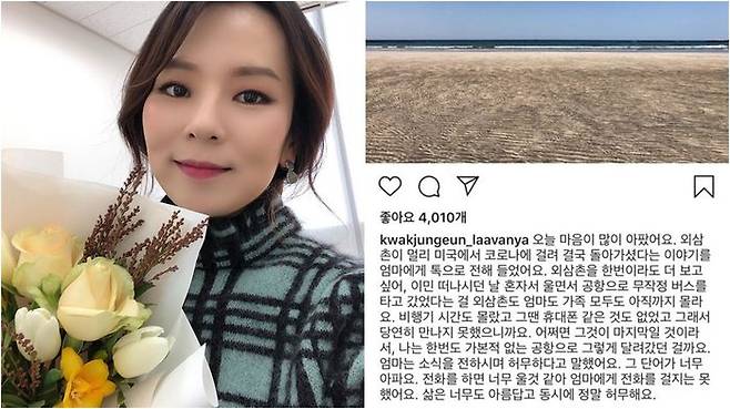 오늘(12일) 곽정은은 자신의 SNS를 통해 "외삼촌이 멀리 미국에서 코로나에 걸려 결국 돌아가셨다는 얘기를 엄마한테 전해 들었다"고 밝혔습니다.