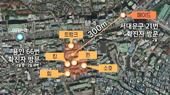 이태원 클럽 관련 첫 확진자로 추정되는 용인 확진자가 1일 밤부터 2일 새벽 들른 클럽은 킹클럽을 포함해 모두 5곳인데, A 씨가 방문한 클럽 메이드는 여기서 약 300미터 정도 떨어져 있으며 두 사람의 동선은 겹치지 않았습니다.