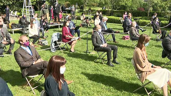 에이자 보건복지부 장관부터 매커내니 백악관 대변인, 대통령의 맏사위 쿠슈너 선임 보좌관까지, 백악관 기자회견에 참석한 모든 사람들이 마스크를 썼습니다.