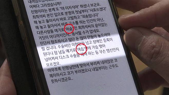 폭행 피해를 호소하다 극단적 선택을 한 경비원 59살 최희석 씨가 가해자로 지목한 주민 A 씨에게 받은 문자 메시지입니다.