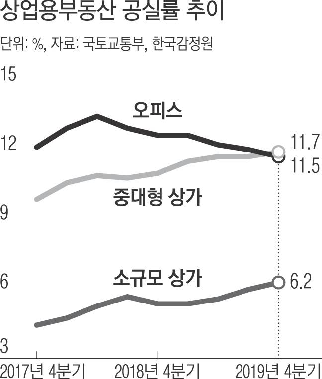 국토부는 지난해 8월 ‘공공주택 업무처리지침’ 개정을 통해 위례·세종 등 개발이 진행 중이거나 개발이 예정된 공공택지의 경우 예상 인구의 규모나 소비성향, 구매력 등을 감안한 상가 수요를 산출해 상업용지를 정하도록 한 바 있다. 최근 3년 새 중대형·소규모 상가의 공실률이 계속 높아지고 있는 데도 상업용지 공급이 늘고 있는 추세를 감안한 조치였다. 중대형 상가의 공실률은 2017년 4분기 전국 평균 9.7%에서 지난해 4분기엔 11.7%로 상승했고, 소규모 상가도 같은 기간 공실률이 4.4%에서 6.2%로 높아졌다.