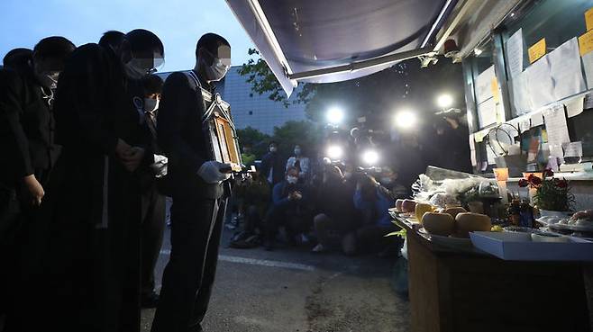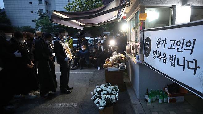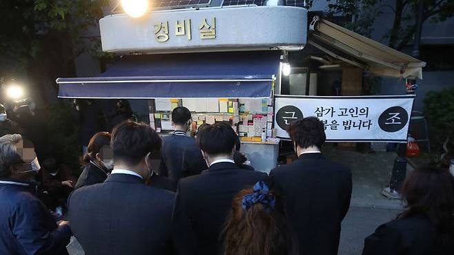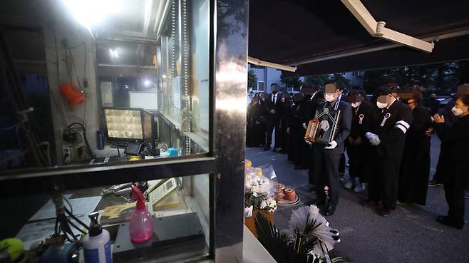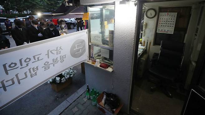 14일 오전 서울 강북구 우이동 한 아파트 경비실 앞에서 아파트 경비원으로 일하다 주민 괴롭힘에 최근 극단적 선택을 한 최희석 경비원의 유족들이 노제를 지내고 있다.