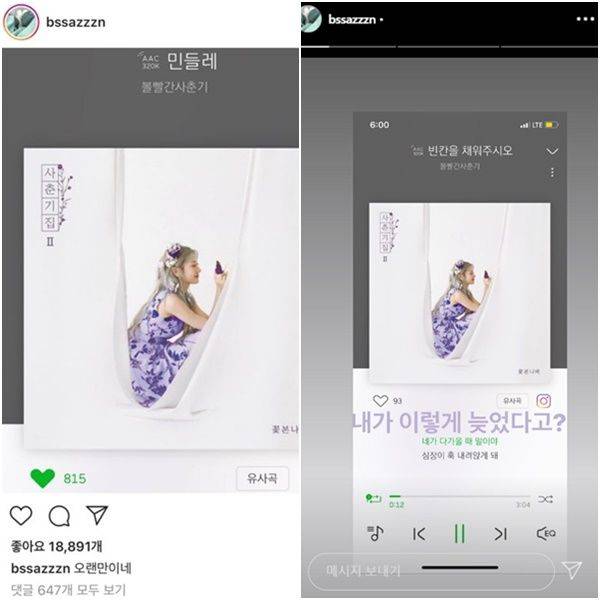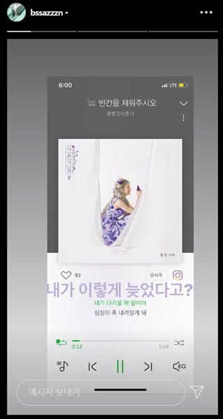 또 인스타그램 스토리에는 음원이 공개된 6시 정각에 수록곡 '빈칸을 채워주시오' 스트리밍 화면을 인증하며 "내가 이렇게 늦었다고?"라는 재치 있는 글을 덧붙이기도 했습니다.