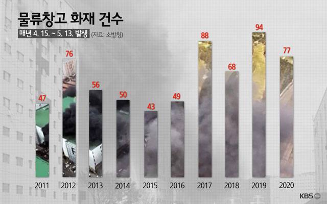 지난달 15일부터 지난 13일 사이 물류창고에서 일어난 화재 건수는 모두 77건, 전체의 절반 이상인 45건이 담배꽁초와 같은 부주의로 인해 발생했습니다. 지난해 같은 기간 물류창고 화재는 94건으로 올해에는 오히려 17건 줄었습니다.