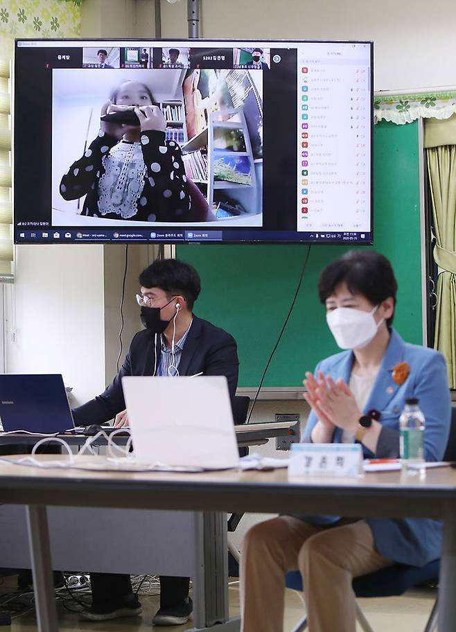 스승의 날인 15일 대구 달성군 논공읍 남동초등학교에서 강은희 대구시교육감이 온라인으로 진행된 스승의날 행사를 보고 있다.